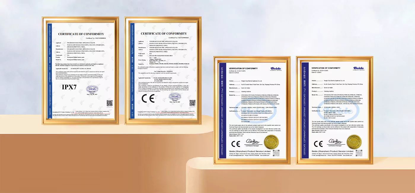 เครื่องซักผ้าและเครื่องทำความเย็นด้วยลมของเราผ่านมาตรฐานการทดสอบของสหภาพยุโรปและได้รับการรับรอง CE แบตเตอรี่มีระดับการกันน้ำ IPX7 นอกจากนี้เรายังได้รับการรับรองว่าเป็นผู้ขายที่โดดเด่นบนแพลตฟอร์มอีคอมเมิร์ซในประเทศและอาลีบาบา